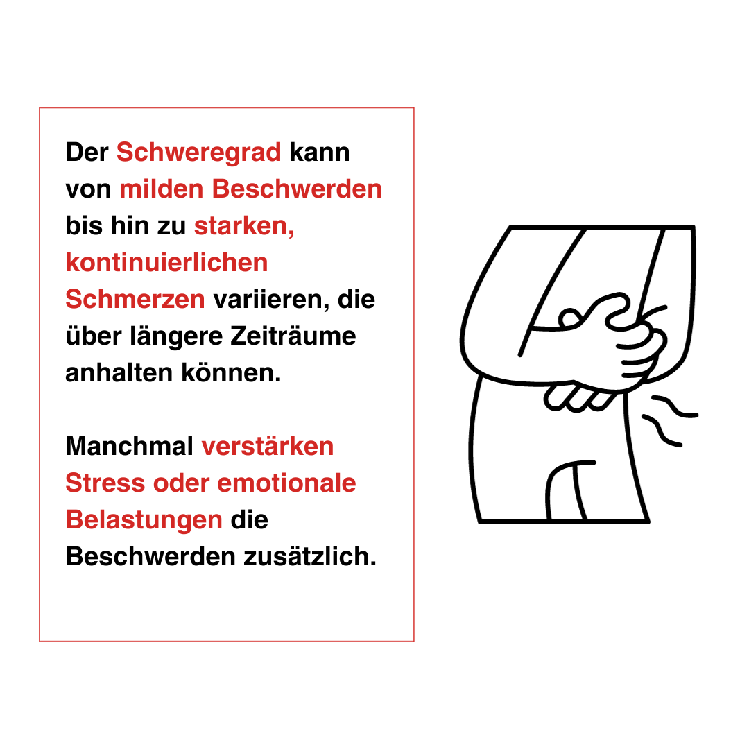 Der Schweregrad kann von milden Beschwerden bis hin zu starken, kontinuierlichen Schmerzen variieren, die über längere Zeiträume anhalten können. Manchmal verstärken Stress oder emotionale Belastungen die Beschwerden zusätzlich.