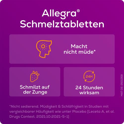 - KINDERLEICHTE EINNAHME: Allegra® Schmelztabletten für Kinder zergehen auf der Zunge und können ohne Wasser eingenommen werden. Sie kontrollieren Allergiesymptome für 24 Stunden bei nur 1x täglicher Einnahme.
