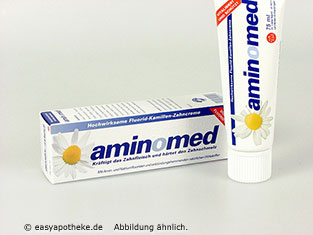 Aminomed Fluorid Kamillen Zahncreme wird angewandt zur sanften und hochwirksamen Reinigung der Zähne, zur Kariesprophylaxe und zum Schutz vor Parodontose. Die Zahncreme enthält eine Wirkstoffkombination aus Aminflourid und Natriumfluorid, welche einen hohen Kariesschutz gewährleistet. Die Fluoridionen des Aminfluorid lagern sich optimal im Zahnschmelz ein. Aminomed enthält außerdem noch Xylit, ein Extrakt aus Kamillenblütenköpfen, Bisabolol, Panthenol, Putzkörpern, ätherischen Ölen. Kamille hat eine beruhigende Wirkung auf die gereizte Mundschleimhaut. Bisabolol hat eine entzündungshemmende Wirkung. Xylit sorgt für eine Verzögerung der Plaquebildung und hemmt kardiogene Bakterien. Panthenol pflegt das Zahnfleisch und sorgt für die Wundheilung der geschädigten Mundschleimhaut. Aminomed eignet sich besonders bei empfindlichem Zahnfleisch und sensiblen Zähnen.