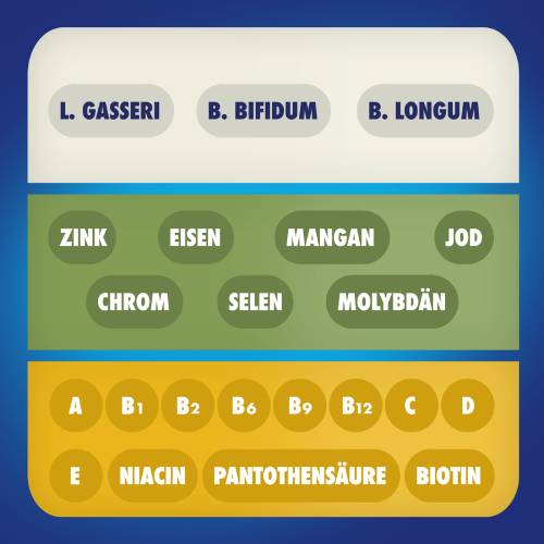- 3-in-1 Tablette: 3-Schicht-Tablette kombiniert Vitamine & Mineralstoffe mit Bakterien der Darmflora, die Dank einer speziellen Beschichtung den Darm lebend erreichen können.3