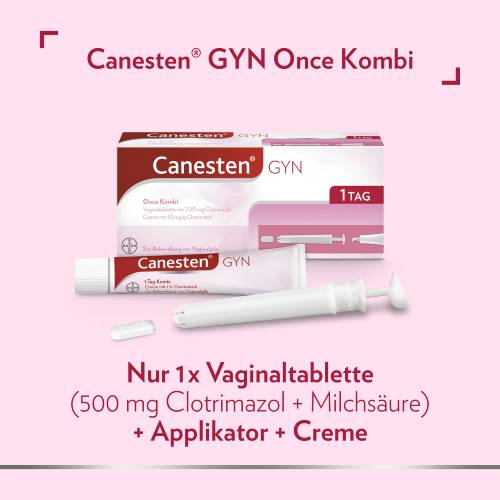 Mit der Canesten® GYN Once Kombi steht Ihnen eine effektive Ein-Tages-Kombi, bestehend aus einer Vaginaltablette zur inneren und einer Creme zur äußeren Anwendung zur Verfügung. Das Besondere: Die Vaginaltablette verfügt über eine Depotwirkung, sodass der maximale Wirkstoffspiegel kontinuierlich über einen Zeitraum von 72 Stunden erhalten bleibt. Zudem kommt es zu einer schnellen Linderung der unangenehmen Symptome wie Juckreiz und Rötung. Unter ärztlicher Aufsicht ist die Canesten® GYN Once Kombi auch in der Schwangerschaft anwendbar.