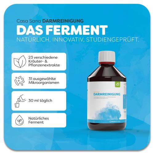 Casa Sana DARMREINIGUNG ist ein hochwertiges, fermentiertes Komplex-Konzentrat aus 23 ausgewählten Kräuter- und Heilpflanzenextrakten sowie 31 nützlichen Bakterienstämmen in Apothekenqualität. Das trinkfertige Präparat trägt zur Regeneration des Darms und zur Regulierung der Verdauung bei – sanft, ganz natürlich und ohne abführende Wirkung. Casa Sana DARMREINIGUNG ist ein natürliches Ferment. Die 23 Kräuter- und Heilpflanzenextrakte werden von den enthaltenen Mikroorganismen fermentiert und daraus entstehen wertvolle Stoffwechselprodukte und Milchsäuren, die die Darmgesundheit positiv beeinflussen können. Casa Sana DARMREINIGUNG fördert den natürlichen Darmaufbau und ist ein wichtiger Baustein einer ganzheitlichen Darmsanierung. Des Weiteren unterstützt Casa Sana DARMREINIGUNG bei der Entschlackung des Körpers, bei Detox-Kuren und bei unterschiedlichen Fastenarten.