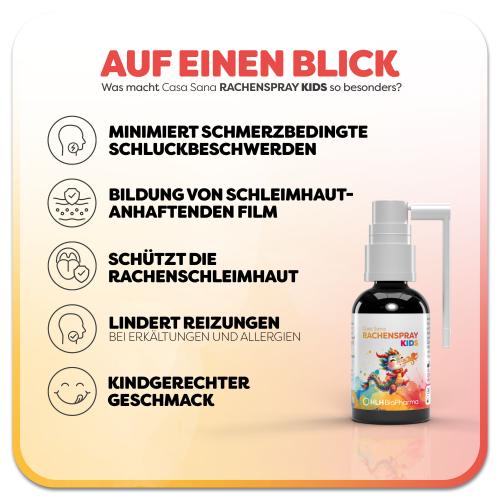 - MUKOADHÄSIVER FILM MIT BARRIEREWIRKUNG: Casa Sana RACHENSPRAY KIDS schützt die Rachenschleimhaut, indem es die Empfindlichkeit gegenüber äußeren Reizungen reduziert