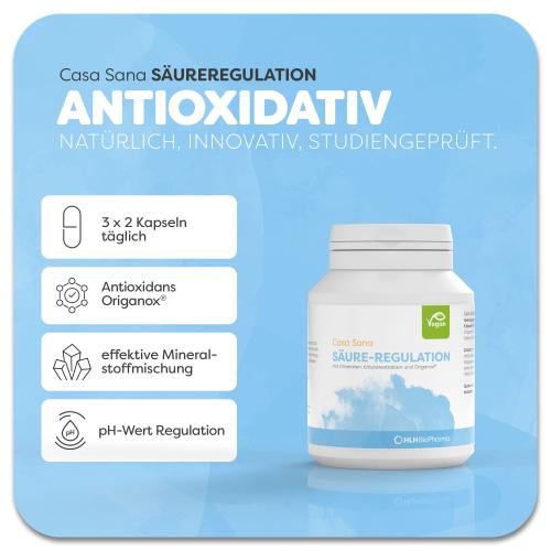Casa Sana SÄURE-REGULATION ist ein hochwertiger Pflanzen- & Mineralstoffkomplex in Apothekenqualität. Das Präparat fördert die natürliche Regulation und Unterstützung des Säure-Basen-Haushaltes bei Übersäuerung und einem niedrigen pH-Wert. Casa Sana SÄURE-REGULATION enthält die traditionell bewährten Pflanzenstoffe Rosmarin, Fenchel, Salbei, Thymian und einen wertvollen Extrakt aus wildem Majoran – das besonders hoch dosierte Antioxidans ORIGANOX® ergänzt durch die Mineralstoffe Kaliumhydrogencarbonat, Natriumbicarbonat, Magnesium und Calcium (als Citrate).