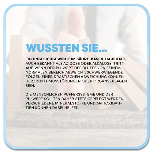Der Säure-Basen-Haushalt funktioniert wie ein fein abgestimmtes System, das ständig dafür sorgt, den pH-Wert im Blut stabil zu halten. Säuren entstehen ganz natürlich und Basen wirken diesen Säuren entgegen. Der Körper gleicht dieses Verhältnis permanent aus, ähnlich einem inneren Regelsystem, damit Zellen, Enzyme und der gesamte Stoffwechsel richtig funktionieren. Wenn jedoch mehr Säuren entstehen, als ausgeglichen werden können, oder zu wenig Basen zur Verfügung stehen, kann es zu einer sogenannten Übersäuerung kommen. Diese macht sich häufig durch Müdigkeit, allgemeines Unwohlsein oder Verdauungsbeschwerden bemerkbar. Eine längerfristige Störung des Säure-Basen-Gleichgewichts kann zu einem erhöhten Krankheitsrisiko führen und sich unter anderem in Müdigkeit, Erschöpfung und Konzentrationsproblemen äußern. Auch können kaputte Haare, brüchige Nägel, Muskel- und Gelenkbeschwerden, trockene oder unreine Haut, Juckreiz und Cellulite auftreten.