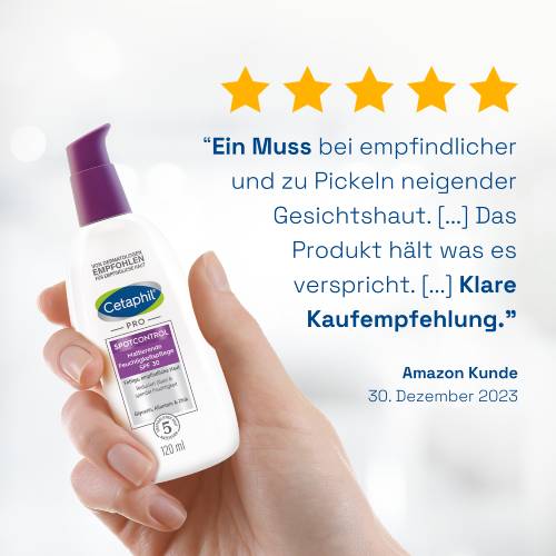 Cetaphil PRO SpotControl Mattierende Feuchtigkeitspflege SPF 30 wurde speziell für die Bedürfnisse fettiger und unreiner Haut entwickelt. Die leichte 3-in-1 Feuchtigkeitspflege reduziert Glanz und Hautunreinheiten, spendet langanhaltend Feuchtigkeit und schützt dank hohem Lichtschutzfaktor vor UVA- und UVB-Strahlen. Für ein gepflegtes und ebenmäßiges Hautbild. Die Feuchtigkeitspflege ist auch zur begleitenden Pflege während der Akne-Therapie geeignet.1 Dermatologische und hautphysiologische Untersuchungen bestätigen die sehr gute Verträglichkeit bei zu Akne und Unreinheiten neigender Haut. Nicht komedogen. Ohne Duftstoffe.