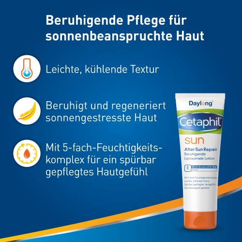 Cetaphil Sun Daylong After Sun ist eine kühlende Pflegelotion zur Beruhigung sonnengestresster Haut. Hierbei hilft der besondere 5-fach Feuchtigkeitskomplex. Er pflegt und beruhigt die Haut mit natürlichen Inhaltsstoffen. Glycerin, Dexpanthenol und Vitamin E spenden der Haut intensive Feuchtigkeit. Wertvolle Sheabutter und Phytosqualen stärken die angegriffene Barrierefunktion der Haut. Die leichte Formulierung zieht schnell ein, klebt und fettet nicht und hinterlässt ein erfrischtes, spürbar gepflegtes Hautgefühl.