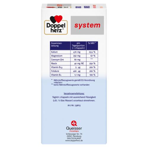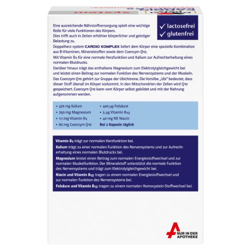 Doppelherz system CARDIO KOMPLEX liefert dem Körper eine abgestimmte Kombination aus B-Vitaminen, Mineralstoffen und Coenzym Q10. Ein gesundes Herz schlägt täglich etwa 100.000 Mal. Bereits innerhalb einer Minute wird das gesamte Blutvolumen einmal durch den ganzen Kreislauf gepumpt. Eine ausreichende Nährstoffversorgung spielt eine wichtige Rolle für viele Funktionen des Körpers. Dies trifft auch in Zeiten erhöhter körperlicher und geistiger Belastung zu. Vitamin B1 leistet einen Beitrag für eine normale Herzfunktion und Kalium einen Beitrag zur Aufrechterhaltung eines normalen Blutdrucks. Darüber hinaus trägt das enthaltene Magnesium zum Elektrolytgleichgewicht bei und unterstützt die normale Funktion der Muskeln. Das enthaltene Coenzym Q10 gehört zur Gruppe der Ubichinone. Niacin und Vitamin B12 tragen zu einem normalen Energiestoffwechsel und zur normalen Funktion des Nervensystems bei. Folsäure und Vitamin B12 tragen zu einem normalen Homocystein-Stoffwechsel bei.
