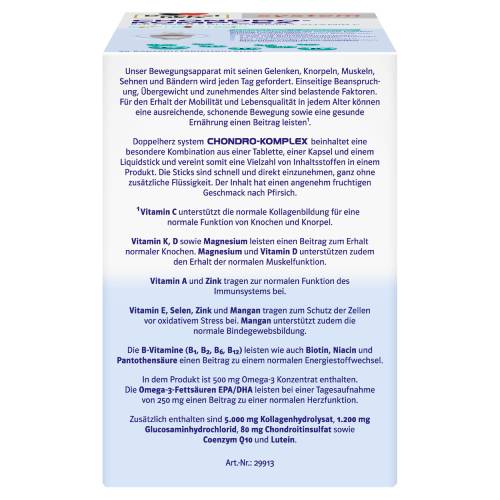 Doppelherz system CHONDRO-KOMPLEX beinhaltet eine besondere Kombination aus einer Tablette, einer Kapsel und einem Liquidstick und vereint somit eine Vielzahl von Inhaltsstoffen in einem Produkt. Die Portionsbeutel sind schnell und direkt einzunehmen, ganz ohne zusätzliche Flüssigkeit. Der Inhalt hat einen angenehm fruchtigen Geschmack nach Pfirsich.