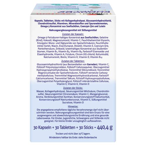 Zusätzlich enthalten sind 5.000 mg Kollagenhydrolysat, 1.200 mg Glucosaminhydrochlorid, 80 mg Chondroitinsulfat sowie Coenzym Q10 und Lutein.