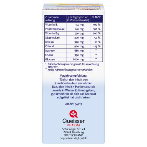 Doppelherz system ELEKTROLYTE RECHARGE ist eine Elektrolyt-Glucose-Mischung mit Vitaminen, Mineralstoffen und Cholin, die zur Zubereitung eines isotonischen Getränks dient. Ob im Beruf, beim Sport oder in der Freizeit – durch intensive Bewegung und starkes Schwitzen kann es zu Verlusten im Wasser- und Elektrolythaushalt kommen. Doppelherz system ELEKTROLYTE RECHARGE kann helfen, diese Verluste wieder auszugleichen. Für unseren Körper ist eine ausreichende Versorgung mit Elektrolyten und Flüssigkeit essenziell. Verliert der Körper schnell viel Flüssigkeit, werden Elektrolyte ausgeschwemmt. Elektrolyte, besonders Natrium, helfen dem Körper dabei den Flüssigkeitshaushalt wieder auszugleichen. Das enthaltene Magnesium trägt zum Elektrolytgleichgewicht bei. Außerdem tragen die Vitamine B2, B5 und B12 zur Verringerung von Müdigkeit und Erschöpfung bei und unterstützen den normalen Energiestoffwechsel. Kalium trägt zu einer normalen Funktion des Nervensystems und zur normalen Muskelfunktion bei. Cholin trägt zu einer normalen Leberfunktion bei. Das macht Doppelherz system ELEKTROLYTE RECHARGE zu einem idealen Begleiter nach dem Sport und bei starker körperlicher Arbeit.