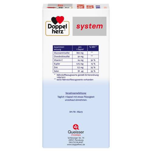 Unser Bewegungsapparat (Knorpel, Knochen, Bindegewebe) wird jeden Tag gefordert. Einseitige Beanspruchung, Übergewicht und zunehmendes Alter sind belastende Faktoren. Für den Erhalt der Mobilität und Lebensqualität in jedem Alter kann ausreichende, schonende Bewegung sowie eine gesunde Ernährung einen Beitrag leisten. Doppelherz system GLUCOSAMIN PLUS 800 enthält eine spezielle Kombination der lebenswichtigen Mikronährstoffe Kupfer, Zink, Selen und Vitamin C. Zusätzlich sind 800 mg Glucosaminsulfat und 50 mg Chondroitinsulfat enthalten. Vitamin C unterstützt die normale Kollagenbildung für eine normale Funktion von Knochen und Knorpel. Kupfer leistet einen Beitrag zur Aufrechterhaltung des Bindegewebes. Das Bindegewebe bildet die Stütz- und Stabilisierungsstrukturen des Körpers. Vitamin C und die Spurenelemente Zink, Selen und Kupfer leisten einen Beitrag zum Schutz der Zellen vor oxidativem Stress. Zink trägt zum Erhalt der normalen Knochen bei. Glucosamin und Chondroitin sind Stoffe tierischen Ursprungs. Glucosamin ist eine spezielle Eiweißstruktur, ein so genannter Aminozucker. Chondroitin gehört zur Gruppe der Glucosaminglycane. Glucosamin ist ein Strukturbestandteil des Panzers der Garnelen. Vitamine und Spurenelemente kann der Körper nicht selbst bilden. Sie sind essentiell und müssen täglich mit der Nahrung aufgenommen werden. Bei unausgewogener Ernährung oder erhöhtem Bedarf kann es zu Versorgungslücken kommen. Vitamine und Mineralstoffe liegen im Körper nur in kleinen Mengen vor, daher nennt man sie auch Mikronährstoffe. Kleine Mengen – große Wirkung: Eine gute Versorgung mit Vitaminen und Mineralstoffen ist eine wichtige Voraussetzung für den normalen Ablauf des Stoffwechsels und einer gesunden Organfunktion. Die Kapseln von Doppelherz system enthalten eine Kombination lebenswichtiger