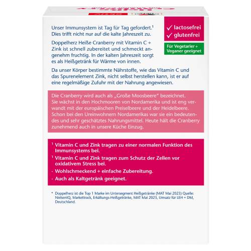 Doppelherz Heiße Cranberry mit Vitamin C + Zink ist dank der einzelnen Portionsbeutel schnell und einfach zubereitet und schmeckt angenehm fruchtig. In der kalten Jahreszeit sorgt es als Heißgetränk für Wärme von innen. Aber es kann in den wärmeren Sommermonaten auch als erfrischendes Kaltgetränk getrunken werden.