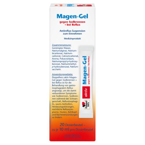 Doppelherz Magen-Gel gegen Sodbrennen + bei Reflux ist ein Medizinprodukt, welches zur Behandlung von gastroösophagealem Reflux zur Linderung der damit verbundenen Symptome wie Sodbrennen, Sodbrennen in der Schwangerschaft, Refluxösophagitis, saures Aufstoßen, Verdauungsbeschwerden, nächtliche Refluxsymptome, Husten und Kehlkopf-Rachen-Entzündung vorgesehen ist.