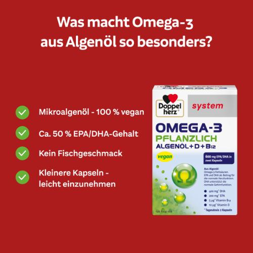 Doppelherz system OMEGA-3 PFLANZLICH liefert Omega-3-Fettsäuren auf nicht-tierischer Basis. Es werden nur Kapseln pflanzlichen Ursprungs eingesetzt. Sie sind somit ideal für alle, die auf tierische Produkte verzichten wollen.