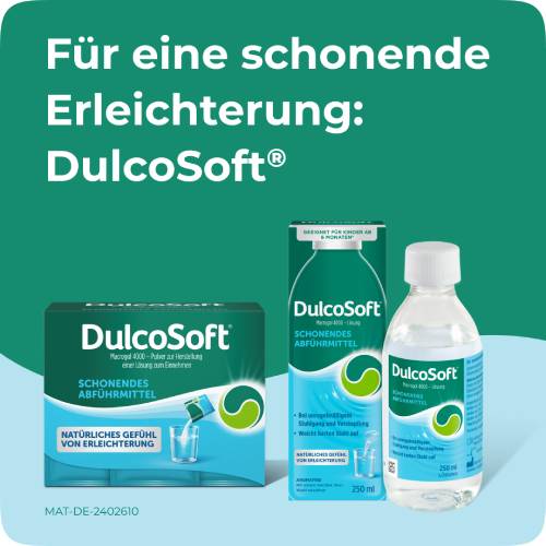 Die Wirkung setzt etwa 24 bis 72 Stunden nach der Einnahme ein. Daher eignet sich DulcoSoft® Lösung zur Behandlung von Verdauungsbeschwerden, wenn keine unmittelbare Darmentleerung, sondern eine schonende Unterstützung der natürlichen Verdauungstätigkeit gewünscht ist. DulcoSoft® Lösung kann Erleichterung bei unregelmäßigem, hartem Stuhlgang verschaffen und Ihnen zu einem angenehmeren Toilettengang verhelfen. Die Wirkung von DulcoSoft® Lösung ist so schonend, dass sie bereits für Kinder ab 6 Monaten geeignet ist. Sie unterstützt den natürlichen, körpereigenen Stuhldrang. Eine Planung der Einnahme ist nicht notwendig, da ein plötzlicher Drang nicht zu erwarten ist.