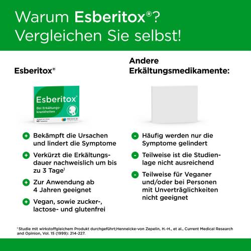Bei ersten Schluckbeschwerden, erstem Halsweh, beginnender Schnupfnase oder Druck auf den Bronchien eingenommen wirkt Esberitox am effektivsten. Gemeinsam bekämpfen Färberhülse, Sonnenhut und Lebensbaum die Erkältung aus verschiedenen Richtungen; unter anderem werden die Viren direkt bekämpft, das Immunsystem gestärkt und gleichzeitig werden Keim vernichtende Fresszellen aktiviert.