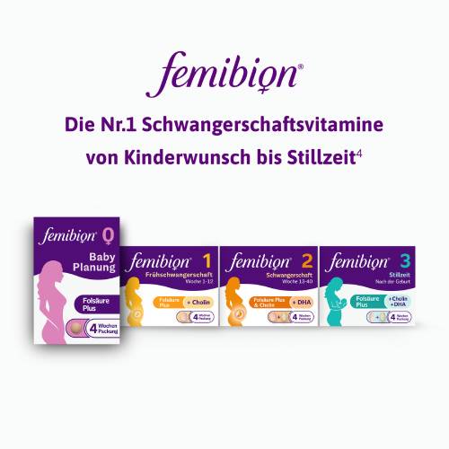Die Nr. 1 unter den von Gynäkologen empfohlenen Marken*: Während der Schwangerschaft benötigt dein Baby für seine gesunde Entwicklung¹ verschiedene Nährstoffe, inklusive Folsäure. Femibion® bietet für jede Phase, von Kinderwunsch bis zur Stillzeit, speziell zugeschnittene Nährstoffkombinationen.