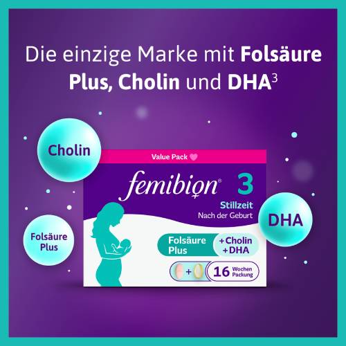 ³Femibion® ist die einzige Marke in Deutschland mit Folsäure Plus (eine Kombination aus Folsäure und Metafolin®) und Cholin.