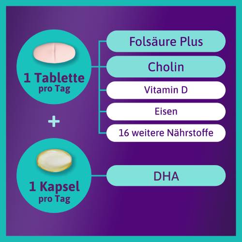 - Ausgewählte Vitamine, Nährstoffe und DHA, aufgeteilt in 1 tägliche Kapsel und 1 tägliche Tablette