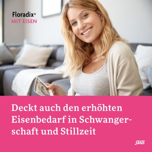 Floradix mit Eisen: Wirkstoff: Eisen(II)-gluconat. Anwendungsgebiet: Bei erhöhtem Eisenbedarf, wenn ein Risiko für die Entstehung eines Eisenmangels erkennbar ist. Ein erhöhter Eisenbedarf besteht insbesondere bei erhöhtem Eisenverlust, z.B. bei der Menstruation. Weiterhin besteht ein erhöhter Eisenbedarf während der Schwangerschaft und Stillzeit sowie in der Erholungszeit nach Krankheiten. Enthält Fructose und Invertzucker. Bitte Packungsbeilage beachten.