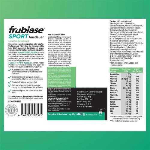 Schon mit einer Portion (40 g) des frubiase® SPORT AUSDAUER Brausepulvers mit frischem Limettengeschmack vor oder während des Sports können ambitionierte Ausdauersportler den Körper mit allen wichtigen Nährstoffen versorgen und gleichzeitig den Blutzuckerspiegel während Training und Wettkampf stabil halten.