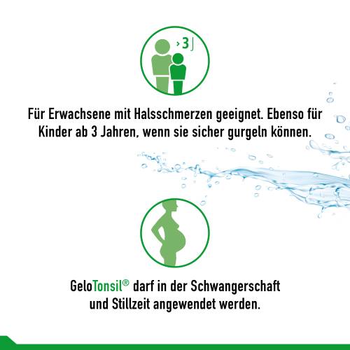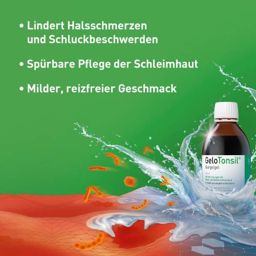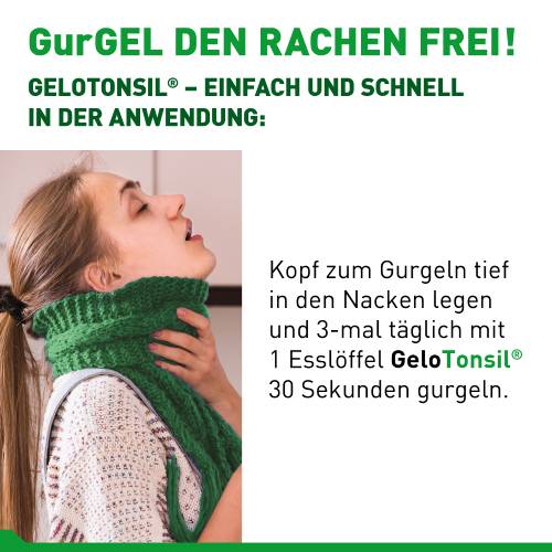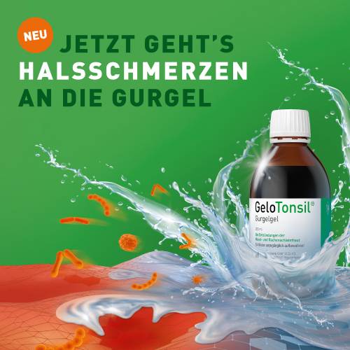 Das einzigartige GeloTonsil® Gurgelgel mit mildem, reizfreiem Geschmack wirkt zweifach aktiv gegen Halsschmerzen und Schluckbeschwerden. Durch das Gurgeln werden Erreger von Halsschmerzen mechanisch entfernt und gleichzeitig wird die entzündete Schleimhaut mit einem schützenden Gelfilm überzogen und so die Schmerzen gelindert.