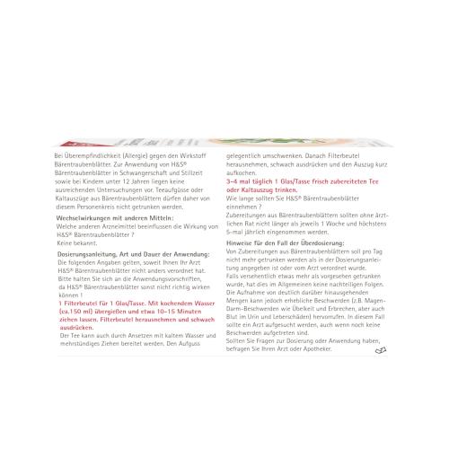 1 Filterbeutel für 1 Glas/Tasse. Mit kochendem Wasser übergießen und etwa 15 Minuten ziehen lassen. Filterbeutel herausnehmen und schwach ausdrücken. Der Tee kann auch durch Ansetzen mit kaltem Wasser und mehrstündiges Ziehen bereitet werden. Danach Filterbeutel herausnehmen, schwach ausdrücken und den Auszug kurz aufkochen. 3-4 mal täglich 1 Glas/Tasse frisch zubereiteten Tee oder Kaltauszug trinken. Zubereitungen aus Bärentraubenblättern sollten ohne ärztlichen Rat nicht länger als jeweils 1 Woche und höchstens 5 mal jährlich eingenommen werden. Teeaufgüsse aus Bärentraubenblättern dürfen von Schwangeren und Kindern unter 12 Jahren nicht getrunken werden.
