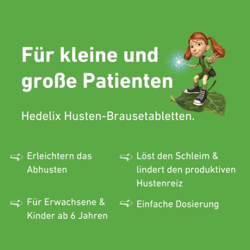 Die Hedelix Husten Brausetabletten werden zur Besserung der Beschwerden bei chronisch-entzündlichen Bronchialerkrankungen angewendet. Die Brausetabletten enthalten als rein pflanzlichen Wirkstoff einen Trockenextrakt aus Efeublättern. Der Arznei-Efeu ist in der Lage den Husten und den Schleim zu lösen und den Hustenreiz zu lindern. Bei einer Bronchitis kann es zu Beschwerden wie zum Beispiel vermehrte Bildung zähflüssigen Schleims, Atemnot und Hustenreiz kommen. Die Brausetabletten ermöglichen bei Atemwegerkrankungen eine hochwertige Therapie. Bei den Hedelix Husten Brausetabletten handelt es sich um ein wirksames und sehr gut verträgliches Arzneimittel, welches zur Behandlung von Atemwegerkrankungen bei allen Altersklassen geeignet ist.