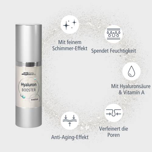 Der Hyaluron Booster Kontur von medipharma cosmetics schafft mit seinem feinen Schimmer-Effekt betonte Gesichtskonturen und einen strahlend frischen Teint. Das enthaltene Hyaluron und Vitamin A wirkt mildernt auf Fältchen und strafft die Haut.