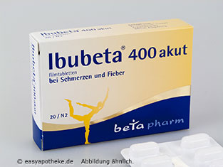 Die Ibubeta 400 akut Filmtabletten werden zur Linderung von maessig stark ausgepraegten Schmerzen und Entzuendungen angewendet. Die Filmtabletten enthalten 400 mg des nichtsteroidalen Antiphlogisticums Ibuprofen. Das Ibuprofen besitzt schmerzstillende, entzuendungshemmende, leicht fiebersenkende und abschwellende Eigenschaften. Es kommt zu einer Hemmung der Produktion von Prostaglandine, wodurch sowohl Schmerz-, als auch Entzuendungsreaktionen gelindert werden. Die Ibubeta 400 akut Filmtabletten helfen bei Zahn-, Kopf- und Regelschmerzen.