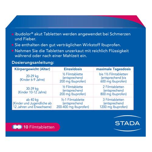 ibudolor akut eignet sich zur Anwendung bei leichten bis mäßig starken Schmerzen wie Kopfschmerzen, Zahnschmerzen und Regelschmerzen. Des Weiteren wird es zur Behandlung von Fieber eingesetzt. Neben seiner schmerzstillenden und fiebersenkenden Wirkung ist ibudolor akut außerdem entzündungshemmend. Das Arzneimittel ist allgemein gut verträglich und weist eine schnelle Wirksamkeit auf.