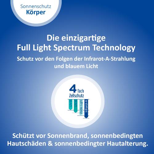 Sonnenstrahlen gibt es in verschiedenen Wellenlängen. Sie haben verschiedene Auswirkungen auf die Haut, wirken jedoch alle zellschädigend. Daher ist es wichtig einen Sonnenschutz zu verwenden, der rundum schützt. Dank einzigartigem 4-fach Zellschutz schützt das Ladival® Allergische Haut Sonnenschutz-Gel vor UV-A- und UV-B-Strahlen, vor den Folgen der Infrarot-A-Strahlung und sichtbarem Licht (einschließlich blauem Licht). So wird die Haut auch vor einer vorzeitigen, sonnenbedingten Hautalterung geschützt.