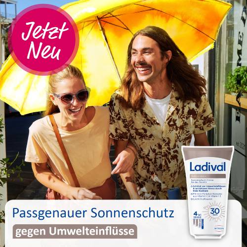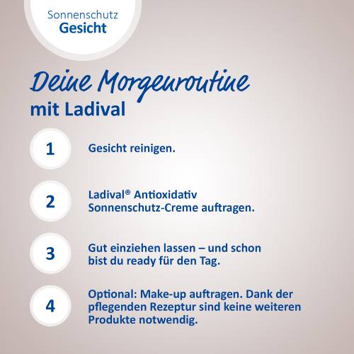 Ganzjähriger Sonnenschutz ist essenziell, da er nicht nur vor Sonnenbrand und sonnenbedingter Hautalterung schützt, sondern auch das Risiko an Hautkrebs zu erkranken reduziert. Um Ihrer empfindlichen Gesichtshaut das ganze Jahr über zusätzlichen Schutz vor schädlichen Einflüssen durch Luftverschmutzung zu bieten, hat Ladival® die Antioxidativ Sonnenschutz-Creme mit Anti-Pollution-Komplex entwickelt. Die Creme enthält Antioxidantien, welche die Zellen vor oxidativem Stress durch freie Radikale schützen.