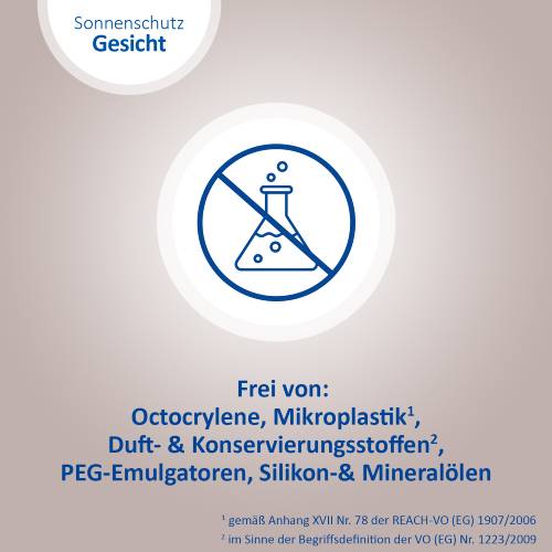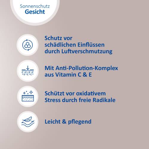 Dank ihrer leichten und pflegenden Rezeptur zieht die Sonnenschutz-Creme schnell ein und bietet eine ideale Grundlage für Make-Up. Sie schützt Ihre Haut effektiv vor sonnenbedingten Zellschäden und dank Anti-Pollution-Komplex aus Vitamin C & E vor oxidativem Stress und freien Radikalen. Die nicht komedogene Formel ist bei empfindlicher Haut, Mischhaut, sowie zu Akne neigender Haut gut geeignet. Die Creme legt sich sanft und unsichtbar auf die Haut, ohne Augenreizungen, Pilling-Effekte (Klumpen des Produktes auf der Haut) oder weiße Rückstände zu hinterlassen – so ist die Sonnenschutz-Creme der perfekte Begleiter im Alltag.