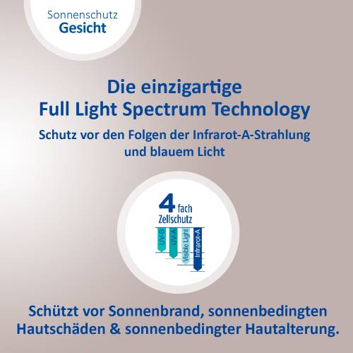 Sonnenstrahlen gibt es in verschiedenen Wellenlängen. Sie haben verschiedene Auswirkungen auf die Haut, wirken jedoch alle zellschädigend. Daher ist es wichtig einen Sonnenschutz zu verwenden, der rundum schützt. Dank einzigartigem 4-fach Zellschutz schützt die Ladival® Antioxidativ Sonnenschutz-Creme vor UV-A- und UV-B-Strahlen, vor den Folgen der Infrarot-A-Strahlung und sichtbarem Licht (einschließlich blauem Licht). So wird die Haut auch vor einer vorzeitigen, sonnenbedingten Hautalterung geschützt.
