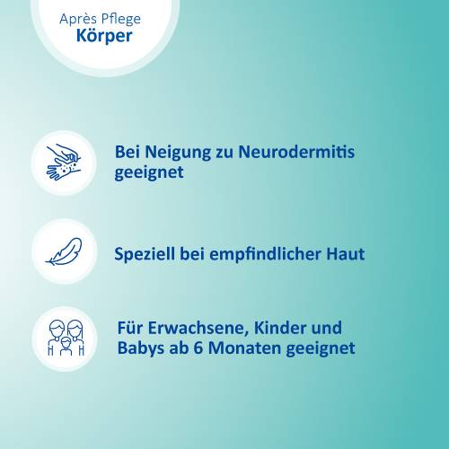 Die Après Pflege-Lotion kühlt sofort angenehm nach dem Auftragen und spendet Ihrer Haut Feuchtigkeit.