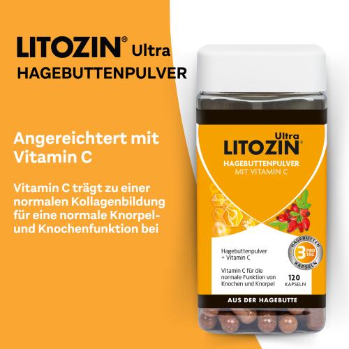 Hagebutterpulver + Vitamin C - Das Beste aus der Natur: LITOZIN ist ein spezielles Nahrungsergänzungsmittel, welches aus den Früchten der Hagebutte hergestellt wird. Die roten Früchte der Hagebutte Rosa canina L. enthalten eine Vielzahl von Pflanzeninhaltsstoffen. In mehrjähriger Untersuchungsarbeit fanden skandinavische Ernährungsexperten heraus, dass die spezielle Hagebuttensorte Rosa canina L. und ein besonders schonendes Herstellungsverfahren nötig sind, um ein Hagebuttenprodukt mit besonders guten Eigenschaften zu erhalten. Nur durch dieses besondere Verfahren kann sichergestellt werden, dass die wertvollen Pflanzenstoffe bei der Herstellung des Hagebuttenpulvers nicht zerstört werden. Für die Herstellung von LITOZIN Ultra Hagebuttenpulver Kapseln wird deshalb das Fruchtfleisch und die Schale der Hagebutte sorgfältig von den Kernen und den stark reizenden Haaren getrennt, sehr schonend zu Pulver verarbeitet und dann in die Kapseln eingefüllt. Um die wertvollen Inhaltsstoffe der Hagebutte zu erhalten, müssen hohe Temperaturen beim Herstellungsprozess vermieden werden. Durch das besondere Herstellungsverfahren enthält LITOZIN einen hohen Anteil an wertvollen Pflanzenstoffen. Das in LITOZIN enthaltene Vitamin C trägt zu einer normalen Kollagenbildung für eine normale Knorpelfunktion bei.
