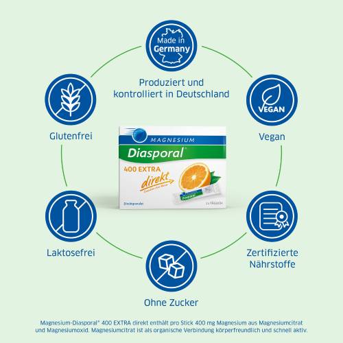 Das Direktgranulat lässt sich schnell und ohne Flüssigkeit einnehmen. Es löst sich direkt im Mund und ist damit ideal für unterwegs. Magnesium-Diasporal® 400 EXTRA direkt eignet sich besonders für Menschen, die viel in Bewegung sind und deshalb einen erhöhten Magnesiumbedarf haben. Es enthält körperfreundliches Magnesiumcitrat und Magnesiumoxid.