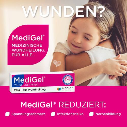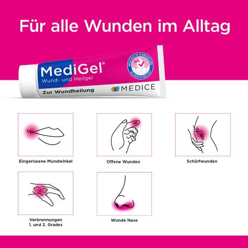 Effektiv und für akute Wunden geeignet: Das ist MediGel® Wund- und Heilgel. Das hydroaktive Lipogel, das eigens von Hautärzten entwickelt wurde, trägt mit Zink- und Eisenionen zu einem pH-Wert-optimierten Wundklima bei und fördert so den natürlichen Heilungsprozess bei Wunden. Gleichzeitig wird sowohl das Infektionsrisiko als auch die Narbenbildung verringert. Dabei optimiert MediGel® die Prinzipien der feuchten Wundheilung – ohne Kruste, ohne Spannungsschmerz.