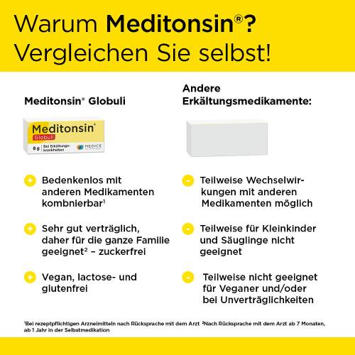 Nach Rücksprache mit dem Arzt kann Meditonsin® bereits Säuglingen ab sieben Monaten verabreicht werden. Kleinkinder ab einem Jahr dürfen auch in der Selbstmedikation mit Meditonsin® behandelt werden.