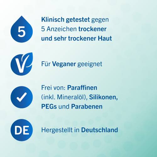 - Klinisch getestet gegen die 5 Anzeichen trockener Haut:Trockenheit, Feuchtigkeitsverlust, Spannungsgefühl, Spröde Haut,Hautirritationen