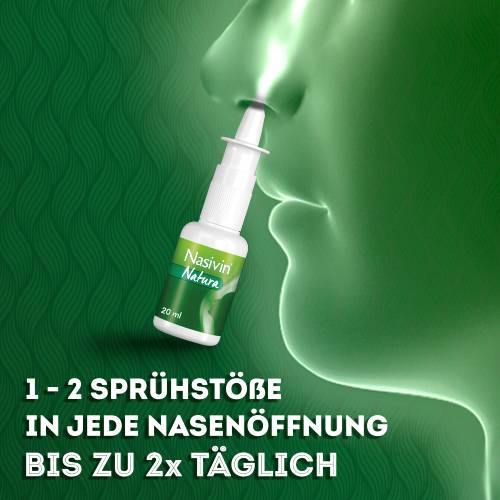 Das Nasenspray ist angereichert mit ProVitamin B5, das hilft, die Nasenschleimhaut zu befeuchten. Nasivin® Natura sorgt für ein sofortiges Erfrischungsgefühl: ätherische Öle aus Menthol, Eukalyptus und Thymian sind natürlichen Ursprungs und verleihen dem Nasenspray einen erfrischenden Duft. Durchatmen auf die natürliche Weise* mit sofortigem Erfrischungsgefühl, Nasivin® Natura. Nasivin® Natura ist für Erwachsene und Kinder ab 12 Jahren geeignet. Es ist leicht anzuwenden: einfach 1 - 2 Sprühstöße bis zu 2-mal täglich in jede Nasenöffnung sprühen.