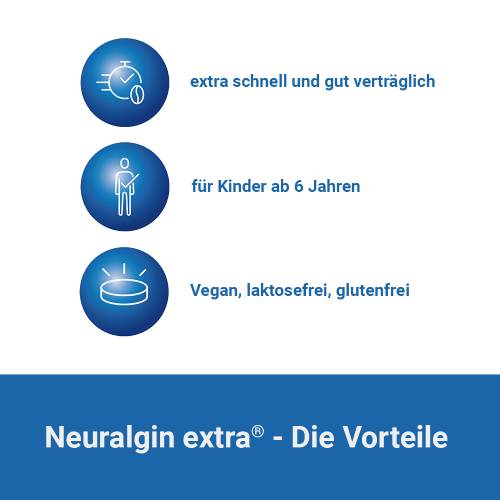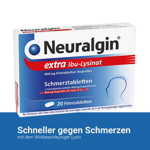 Bei akuten Schmerzen, wie z.B. Kopf-, Zahn- oder Regelschmerz ist schnelle Hilfe gefragt. Neuralgin® extra lindert rasch den Schmerz: Das enthaltene Ibuprofen-Lysin zeigt eine deutlich schnellere Wirkstofffreisetzung als herkömmliches Ibuprofen. Die Schmerztabletten sind bei verschiedensten Arten des Schmerzes effektiv wirksam, auch bei Migräne, Spannungskopfschmerz oder Fieber. Neuralgin® extra ist zudem gut verträglich. Daher ist es bereits für Kinder ab 6 Jahren geeignet.