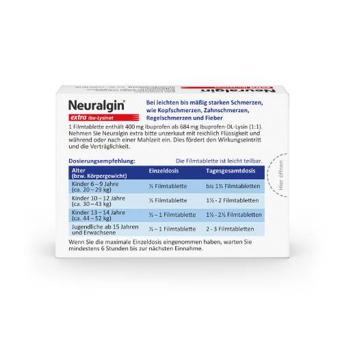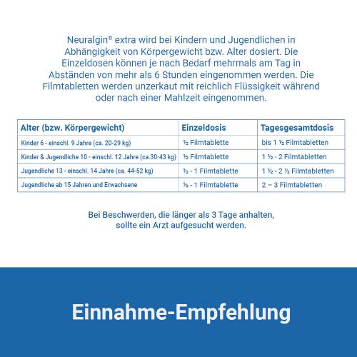 Neuralgin® extra wird bei Kindern und Jugendlichen in Abhängigkeit von Körpergewicht bzw. Alter dosiert. Die Einzeldosen können je nach Bedarf mehrmals am Tag in Abständen von mehr als 6 Stunden eingenommen werden. Die Filmtabletten werden unzerkaut mit reichlich Flüssigkeit während oder nach einer Mahlzeit eingenommen.