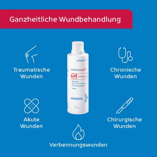 Die Octenisept Lösung wird zur Desinfektion und Reinigung von Wunden angewendet. Die Lösung enthält eine Kombination der beiden Wirkstoffe Octenidin + 2-Phenoxyethanol. Die Kombination dieser beiden Inhaltsstoffe verfügt über bakterizide, fungizide und viruzide Eigenschaften. Octenidin reagiert unter anderem mit Bestandteilen der äußeren Zellwände, wodurch es zu einer Zerstörung der Zellfunktion kommt. 2-Phenoxyethanol zerstört die Eiweiße der Erreger, so dass deren Stoffwechsel verhindert wird. Die Octenisept Lösung eignet sich zur Desinfektion vor Untersuchungen und zur antiseptischen Wundbehandlung.