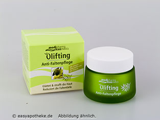 Die Olivenöl Olifting Anti Faltenpflege Creme wird zur täglichen Pflege von reifer Haut angewendet. Die Creme enthält aktive Wirkstoffe aus der Tomate. Diese Wirkstoffe bilden ein Schutzschild gegen die Hautalterung, unterstützen die Haut im Schutz vor UVA und UVB Strahlen, wodurch einer Zellschädigung der Haut vorgebeugt wird. Die enthaltenen Antioxidantien schützen vor freien Radikalen und schädlichen Umwelteinflüssen. Die Olivenöl Olifting Anti Faltenpflege Creme beugt einem Kollagenabbau vor und sorgt dafür, dass sich die Haut glatt und gepflegt anfühlt.