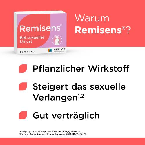 Natürliche und gut verträgliche Unterstützung bei nachlassendem sexuellem Verlangen bietet Remisens, das erste registrierte pflanzliche Aphrodisiakum . Seit dem 1.Juli 2016 ist es in Apotheken erhältlich .
