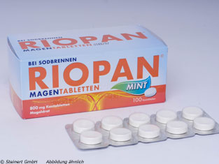 Die bewährten RIOPAN Magen Tabletten zur Anwendung bei Sodbrennen und säurebedingten Magenbeschwerden gibt es auch mit Mint-Geschmack für ein frischeres Atemgefühl. Zudem wird durch das in RIOPAN Magen Tabletten Mint enthaltene Aroma der Speichelfluss angeregt, so dass sich die Tablette besonders angenehm kauen und schlucken lässt. Pro Kautablette sind ebenfalls 800 mg Magaldrat enthalten. Bei Bedarf können mehrmals täglich 1-2 Kautabletten von Erwachsenen und Kindern ab 12 Jahren eingenommen werden, wobei eine Tagesdosis von acht Kautabletten nicht überschritten werden sollte.