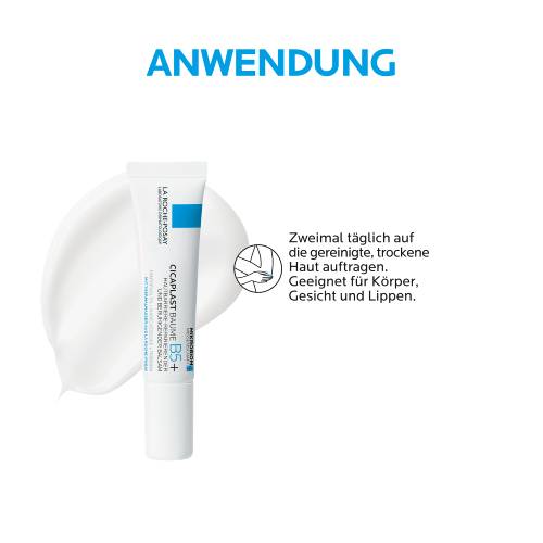 La Roche Posay CICAPLAST Baume B5+ für geschädigte und irritierte Haut kann bei verschiedenen Hautreizungen angewendet werden. Dabei eignet sich die reparierende Salbe für gereizte Haut am Körper, im Gesicht und an den Lippen bei Erwachsenen, Kindern und Babys. Vor der Verwendung sollte die Haut gereinigt werden und trocken sein. Anschließend kann die Wundsalbe auf die entsprechende Hautstelle aufgetragen, sanft verteilt und leicht einmassiert werden.